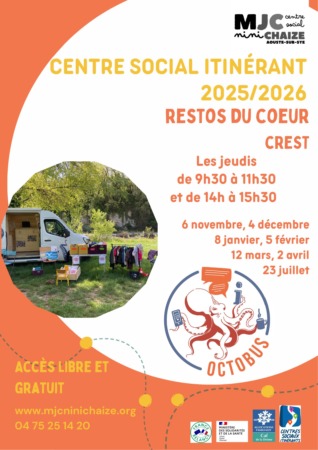 L’octobus, centre social itinérant a été initié en décembre 2021. Il a pour objectif d’aller vers les habitant.e.s dont les jeunes, dans les communes environnantes d’Aouste-sur-Sye et dans les établissements scolaires collèges et lycées.
