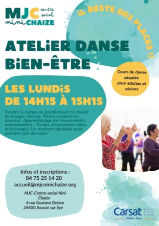 Les lundis de 14h15 à 15h15 à la MJC Centre social Nini Chaize.